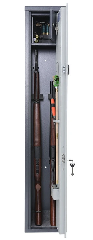 - В верхней части сейфа расположен трейзер (запирающееся на ключ отделение для патронов) размерами 199/147×246×173/90 мм. За узким трейзером остаётся свободное пространство, которое позволяет хранить ружья, по длине соответствующие высоте всего сейфа.