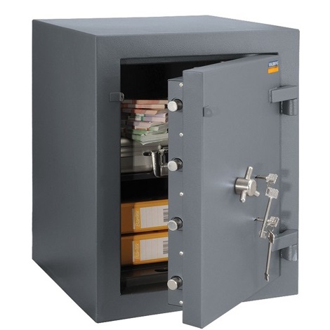 - На дверь сейфа устанавливаются два ключевых замка KABA MAUER производства Германии (в комплекте два ключа к каждому) и трёхсторонняя усиленная ригельная система запирания, а также система блокировки ригельного механизма при взломе.